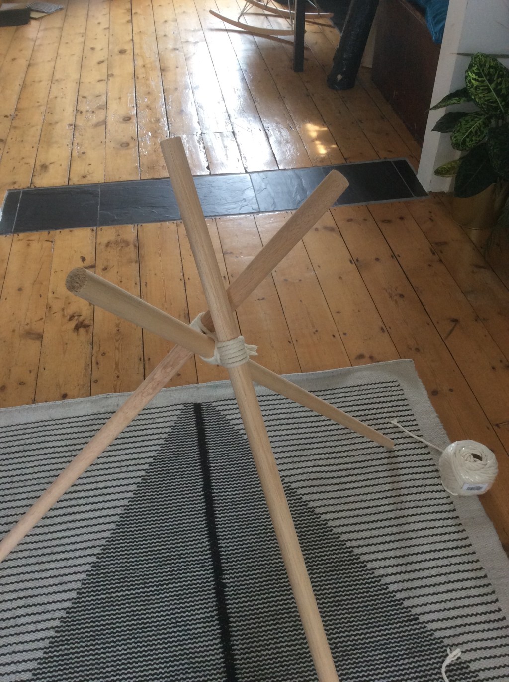 If I had the budget I’d suspend them by wire from the ceiling. But I don’t have the budget, so my lofi DIY solution is to make tripods. This tested my knot making skills so I guess it is boat adjacent in that sense too.