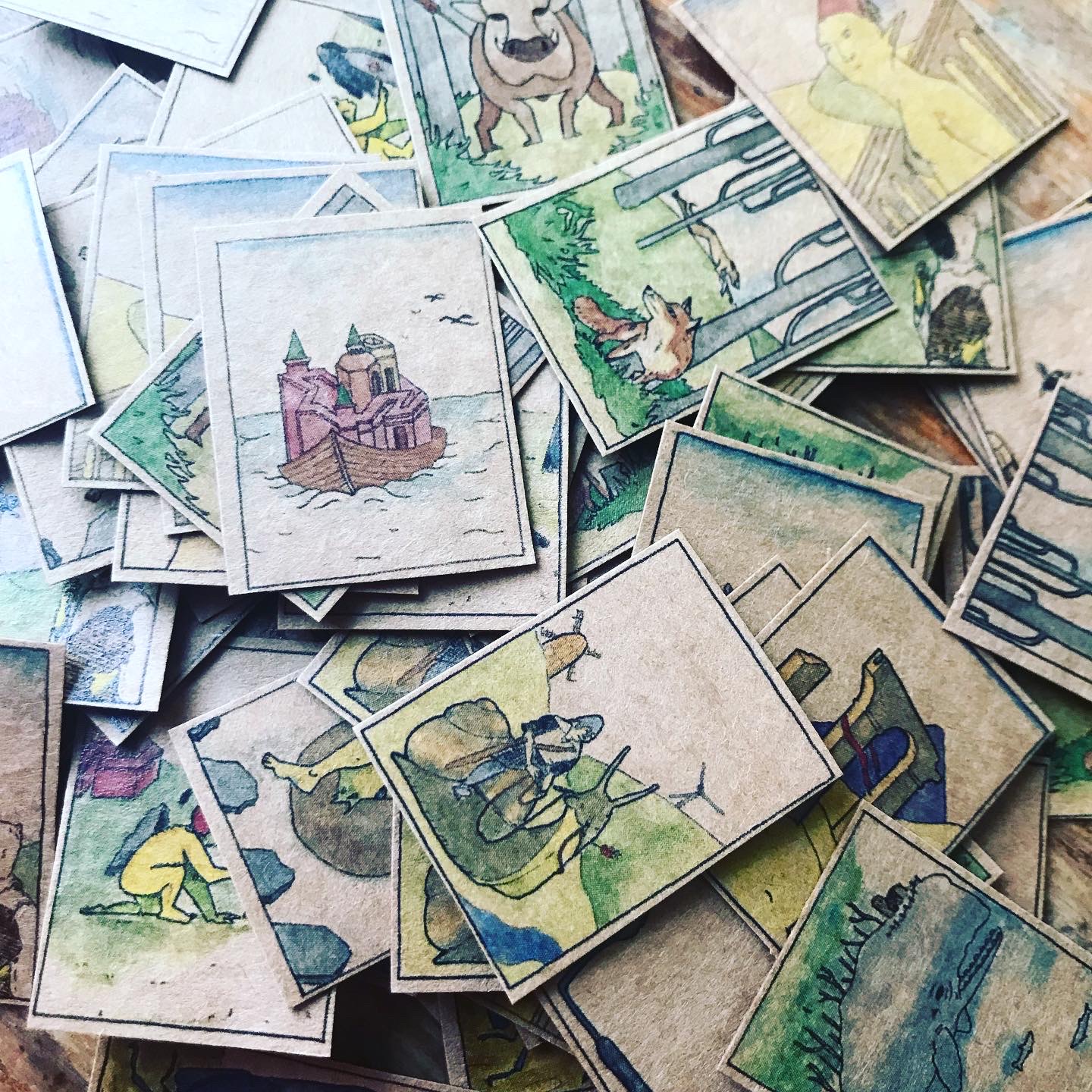 A large painting reminiscent of medieval artwork and the religious paintings of the Northern Rennaissance is littered with strange details: A man hatching from an egg, a city floating in the sky, a tower of impossible architecture. Each detail has a gold symbol nearby, each symbol on the painting matches one of those found on 12 small boxes (dispensors) mounted on the wall next to the painting. The audience is invited to look at the painting and decide which part of the image ‘resonates’ with them. They are then asked to take a small card (approx 2cm tall) from the dispensor that matches the symbol they have selected.