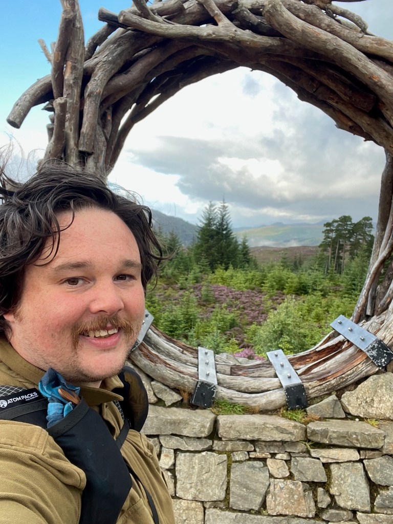 After another rainy night I was glad to wake to find that the clouds were moving on. Before sunrise the valley was lit by bright, fat, full moon that sat lazily over the mountaintops. I waited around at camp, had breakfast, and finally set off at about 8am. I wasn’t aware of it but I was only a twenty minute stroll away from one of the Great Glen Ways most well known spots. Known as a ‘the viewcatcher’, a ring of Scots Pine branches frame a view of the mountains. I was really lucky to see this view as the sun was still climbing. The whole landscape was bathed in bright, golden light.