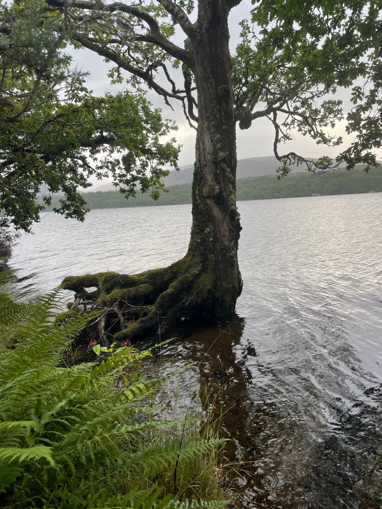 I too was making my way to the shore. Loch Lochy came into view quite soon. The shore’s soft edge was made hazy by mist and even the trees seemed unsure where the border between land and water was. A few trees grew straight out of the water upon peaty mounds. I felt as if I could have walked across the surface of the loch, I could almost have climbed on the mist itself. At the waters edge the world had become entirely desaturated. It was a forest of grey-tones giving way to vistas that hinted at mountains and the journey ahead through the shifting cloud. The scene was at once vibrant with life and monotone in hue.