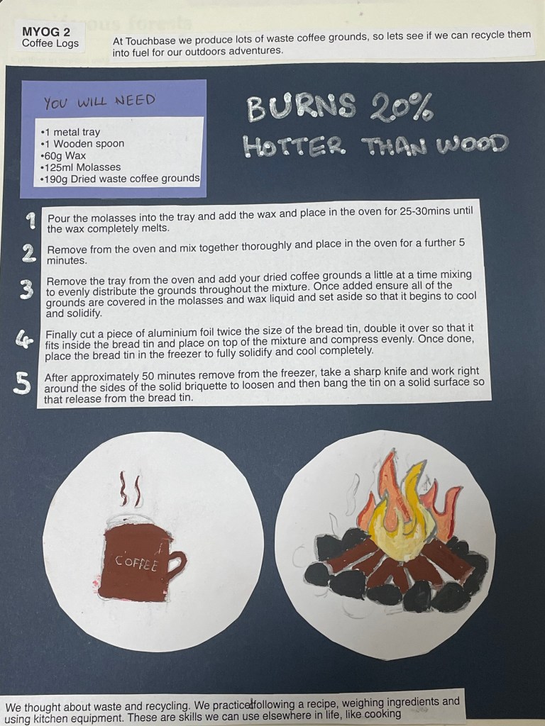 I work at a disability support charity called Touchbase Care, we used making coffee logs as an activity for our outdoors learning sessions. Pictured below is the recipe for how you can make your own.