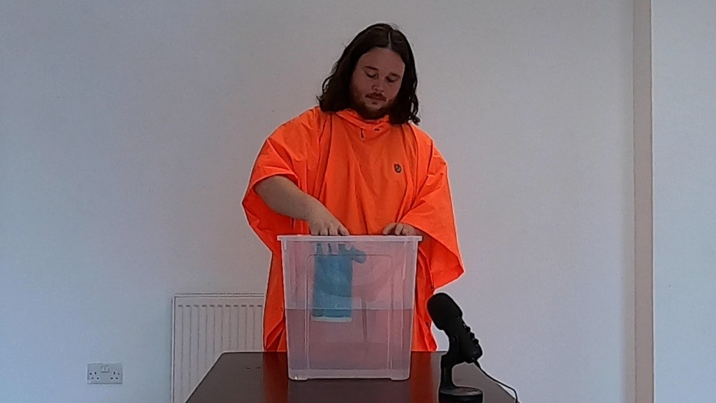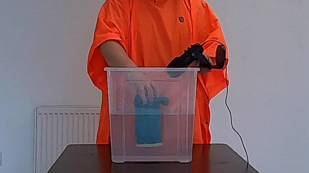 The sound is produced by plunging the vessel into water. The trapped air builds pressure and is expelled through a whistle. Pnuema appears to mimic breathing as it is drawn from and pushed into water.