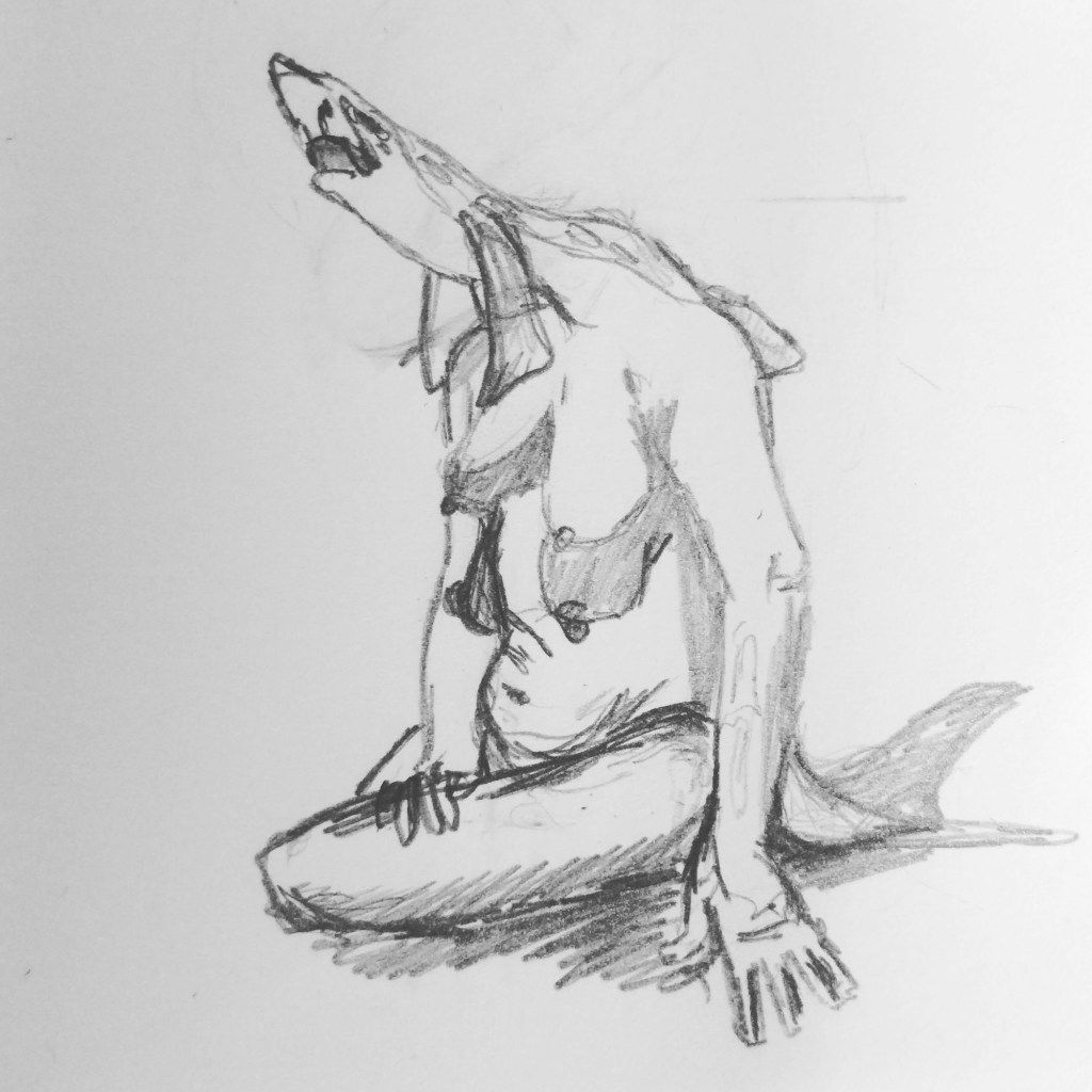 of a dogfish-woman. Fish-nurse on wet rocks.