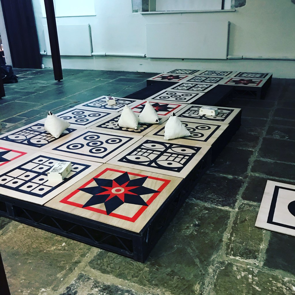 As part of the project I have also made a number of small boards, for audiences to play in the foyer before the main performance. If you would like to know more about the project, purchase your own (small) board, or book the show please use my contact page.